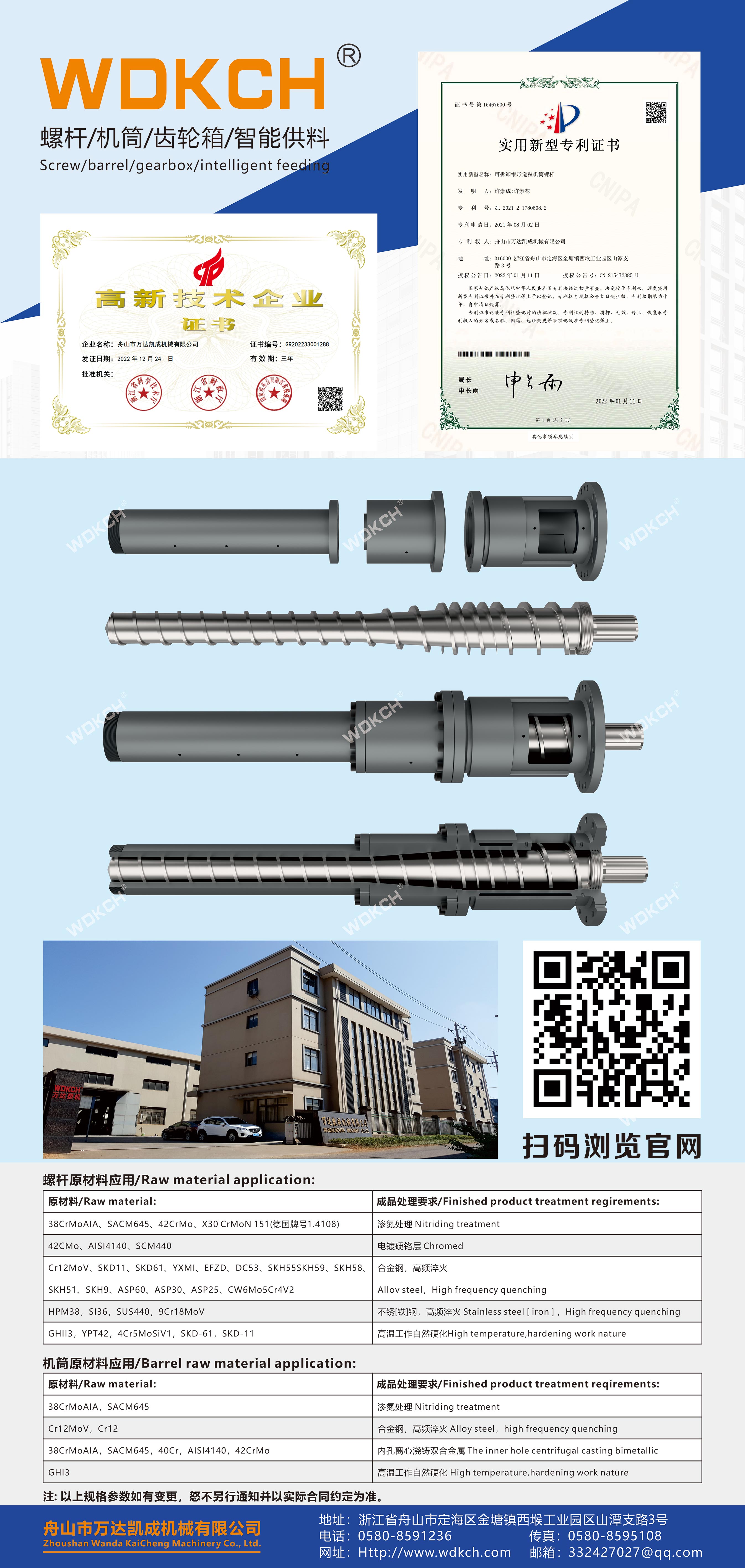 舟山市萬達凱成機械有限公司專業(yè)制造機筒、螺桿、平行雙機筒螺桿、錐雙機筒螺桿、哥林柱、鋼司、齒輪減速箱、簡易塑料成型機械。